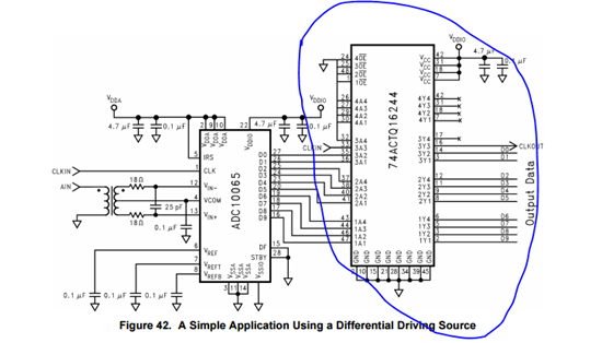 我这边想问一下这个74ACTQ16244的作用,74ACTQ16244是一个缓冲器,可以增加驱动能力。用这个缓冲器是因为ADC的输出管脚的驱动能力不够吗?