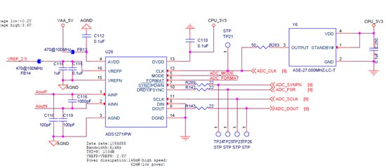 ADS1271采用Frame Sync模式采样,mode选择High-Resolution工作模式,全差分运放倍数为1/3,