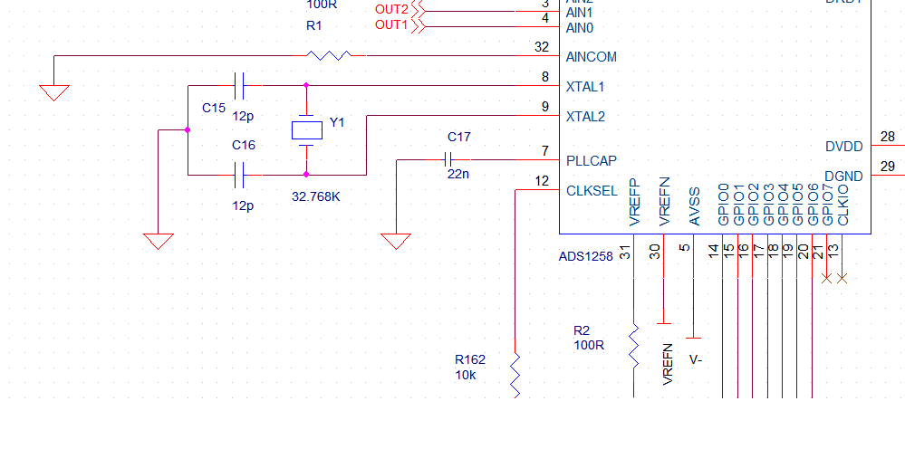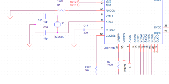 • 你好张工  我在使用ADS1258时 上电后发现片子似乎没反应   硬件连接用的外接32.768晶振匹配电容4.7uf 但是ADS1258底部散热焊盘未接地   机器上电给RESET CS START信号后没反应无DRDY信号  晶振用示波器看不到波形 不知道咋回事了