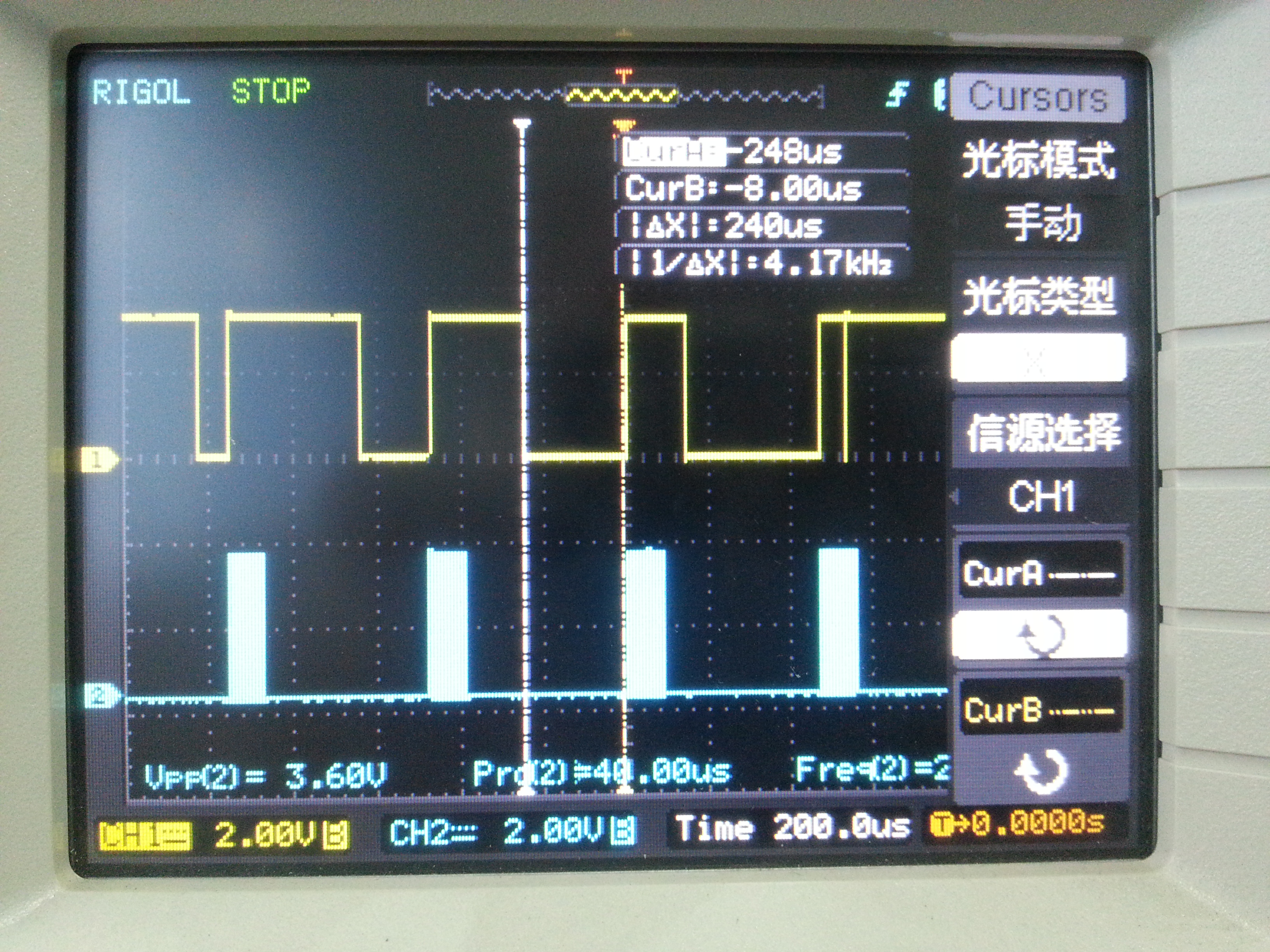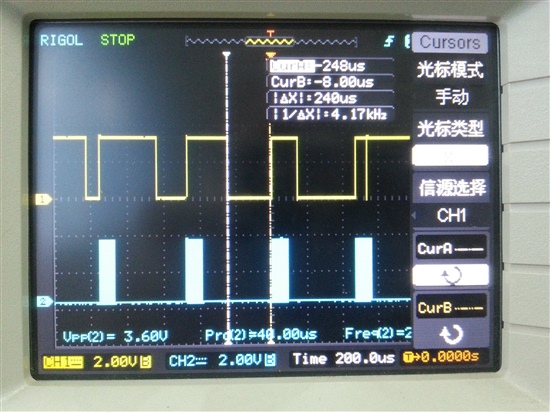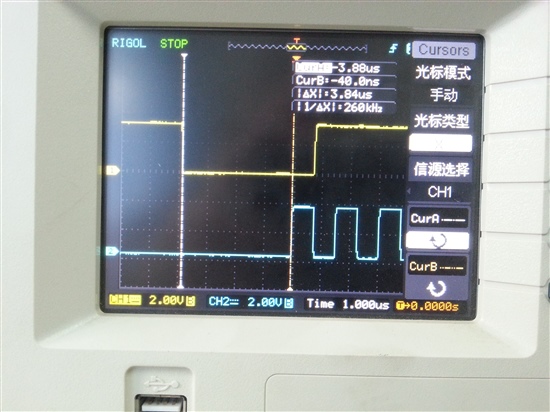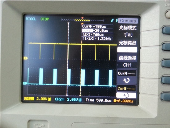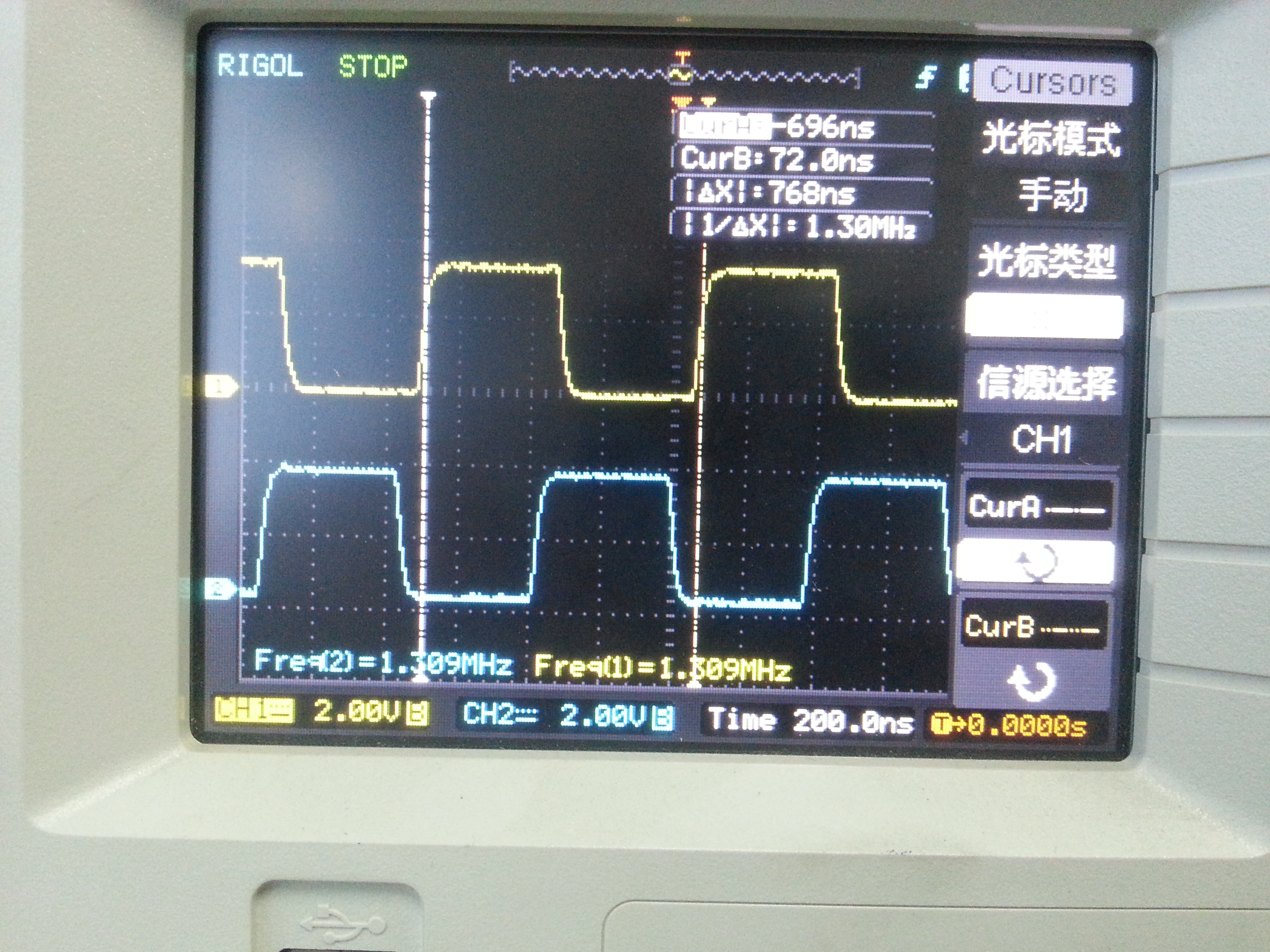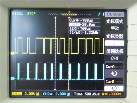 当SCLK和FCLK都为656.25 KHZ时的DRDY的波形正常,如下图,黄色为DRDY,蓝色为SCLK: