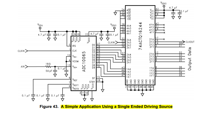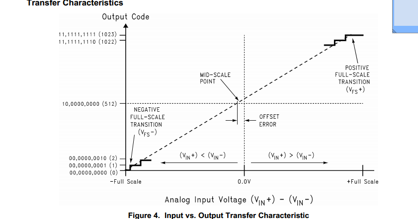 figure41为ADC10065的IRS(input range select)信号接模拟电源,Vin-与Vcom管脚接在一起时,从Vin+单端输入的电压输入范围表示图