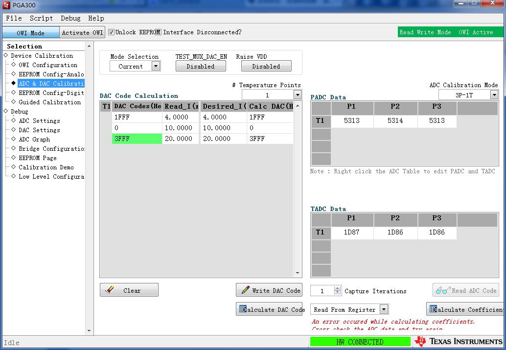 你好!我在使用PGA300EVM时遇到问题:在标定ADC参数时软件提示:ADC系数计算错误,