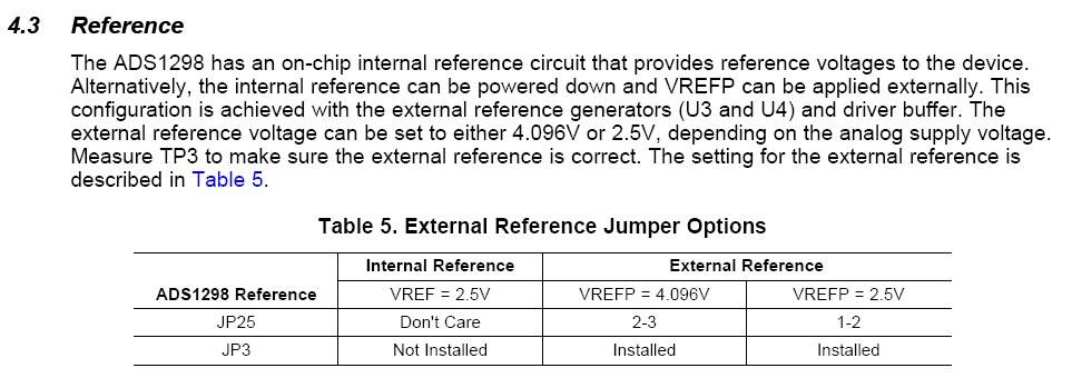 从ADS1298手册第5页看,内部基准应该是2.4V和4V,通过CONFIG3.VREF_4V这个寄存器来选择。对于内部基准的输出,可以参照手册29页图35,从这幅图看,内部基准输出时,是通过一个内部的buffer先放大一下的。