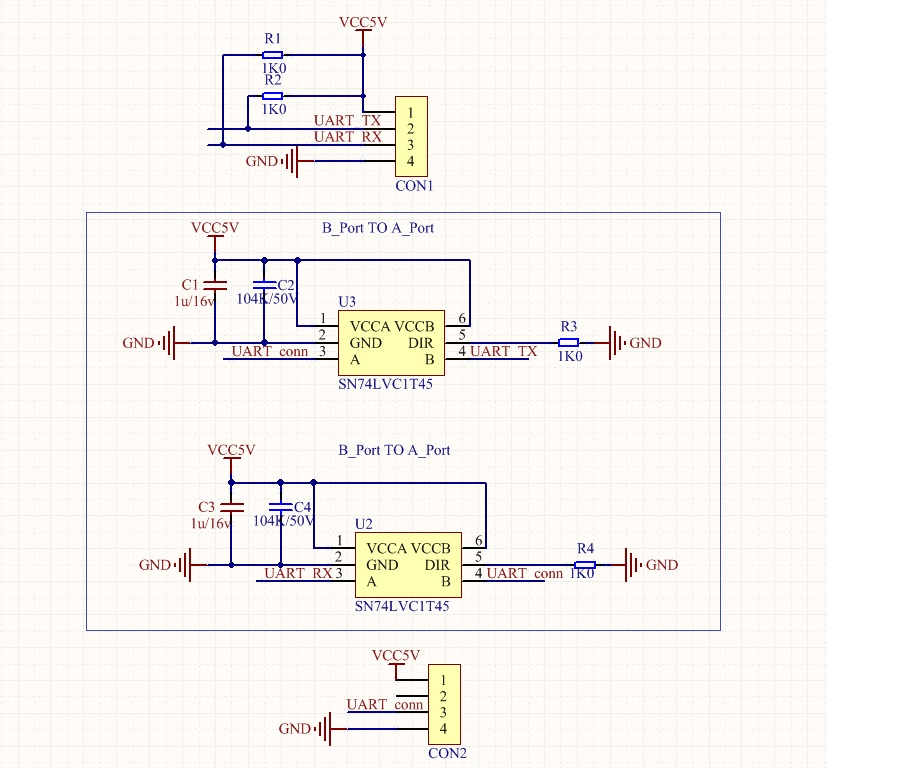我使用SN74LVC1T45做串口的双路转一路控制,如下图,CON1是串口,CON2是转出来的单路信号;