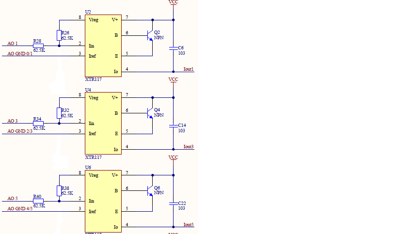 我现在需要将64路电压信号(共AGND)转换成4-20mA信号输出,拟采用XTR117来实现,设计电路如下所示