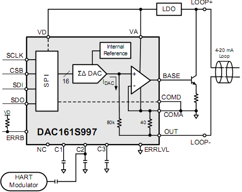 小弟有一个项目需要2路4-20mA的模拟输出,因为处理器端没有DAC,所以期望采用SPI接口的芯片,通过官网查询,我发现“DAC161S997RGHT”这款芯片电路比较简单,但是在绘制原理图时发现,这款芯片的参考实际采用的是外部4-20mA直接供电的方式,我目前产品外部不支持这种供电方式,请问这款芯片如果使用自供电对外电路应该怎么设计?还是说不能选用这款芯片?附件是我目前的原理图,POWER_24V是我板子的总电源输入,SYS_5V0由POWER_24V降压而来,对外输出放了3PIN是因为不确定应该怎么接。