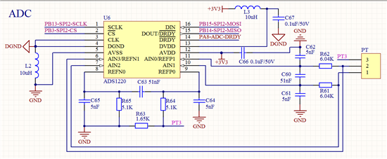 最近开发产品,用了TI的ADS1220作为三线制PT100的温度采样,电路图和PCB布局如下,程序里的参考电压设置在1.65V,但是如果当前环温是20℃的话,用手捏一下PT100,温度上涨缓慢到体温。从松手后再回到20℃的话,需要将近一分钟时间,这个变化时间太长了,是不是我的电路配置有什么问题,为什么会造成温度变化这么缓慢??望各位大神帮忙解答一下,谢谢了