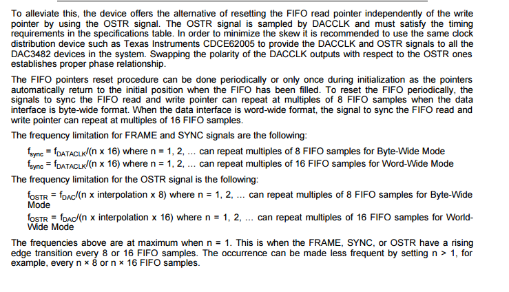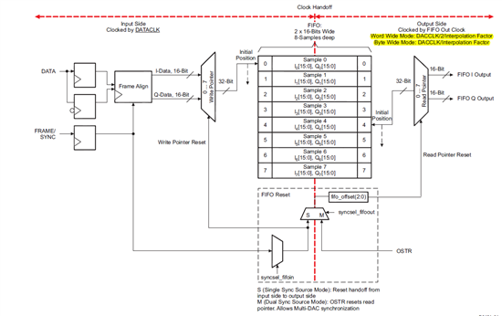下图是DAC3482 中描述FIFO模块的附图,想问下这里在字输入模式下,FIFO的输出时钟速率为什么是DACCLK/2/插值因子?