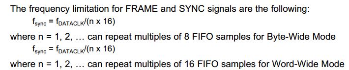 下图是DAC3482 中FIFO的说明。该FIFO的深度是8。在按字宽度输入模式下,为啥SYNC信号每16*n个FIFO采样重复一次?按照我的理解SYNC信号是用来重置FIFO写指针的,FIFO深度是8,那SYNC信号就应该每8*n个FIFO采样重复一次啊,和输入模式无关。求解答!