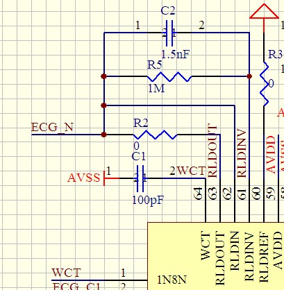 • 我这边用的是12-lead的方式,连接方式都是参考ADS1298收据手册的。右腿驱动的连接图如下,其中ECG_N是右腿的信号。