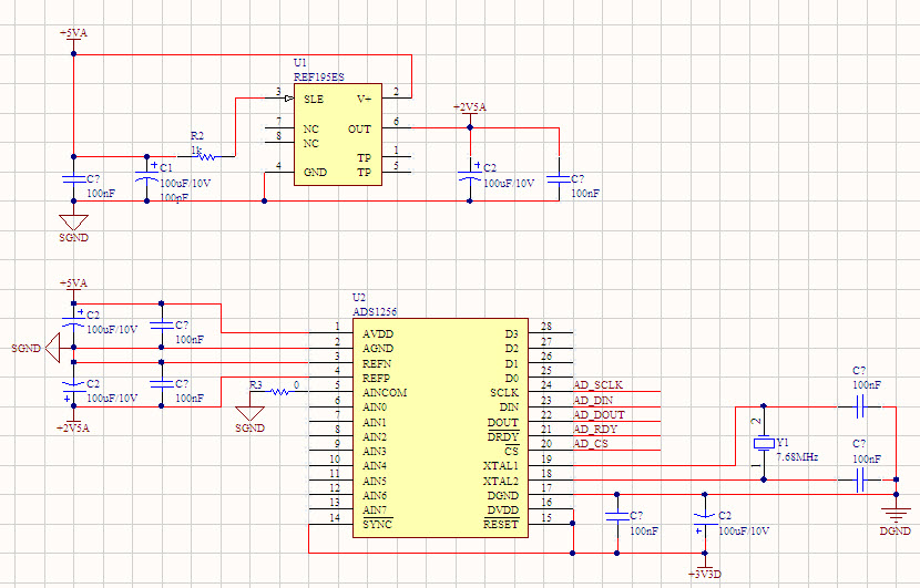 在您的电路中采用的高精度基准源REF195, 如果是这样的话,输入电压需要大于5.2V以上,否则输出电压5V输出会偏离而造成严重的精度损失。输出电容也不需要100uF这么大,选用1~2.2uF陶瓷电容即可.ADC的AVDD.DVDD电容也推荐4.7~10uF陶瓷电容。