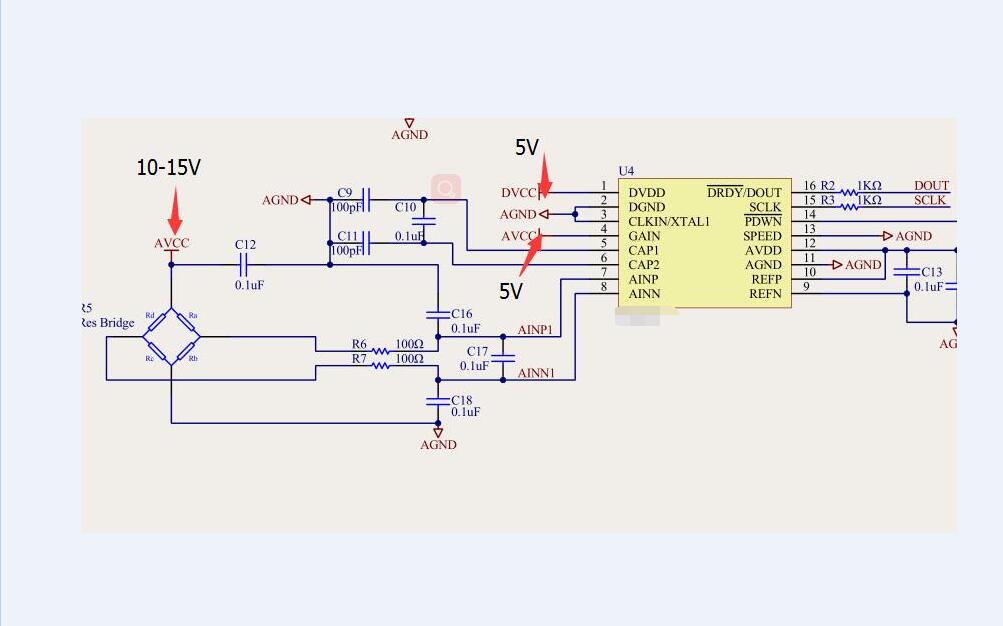如上图所示,使用的芯片是ADS1230芯片,重量传感器的电压是10-15V,芯片的电压都是5V,发现重量传感器输出的电压超出了芯片的量程范围,将重量传感器的电压降到5V就能正常工作了。如果一定要用10-15V电压给重量传感器,那需要怎么处理才能使信号在芯片量程范围内,加运放?且是负反馈?求高手指教,不胜感激