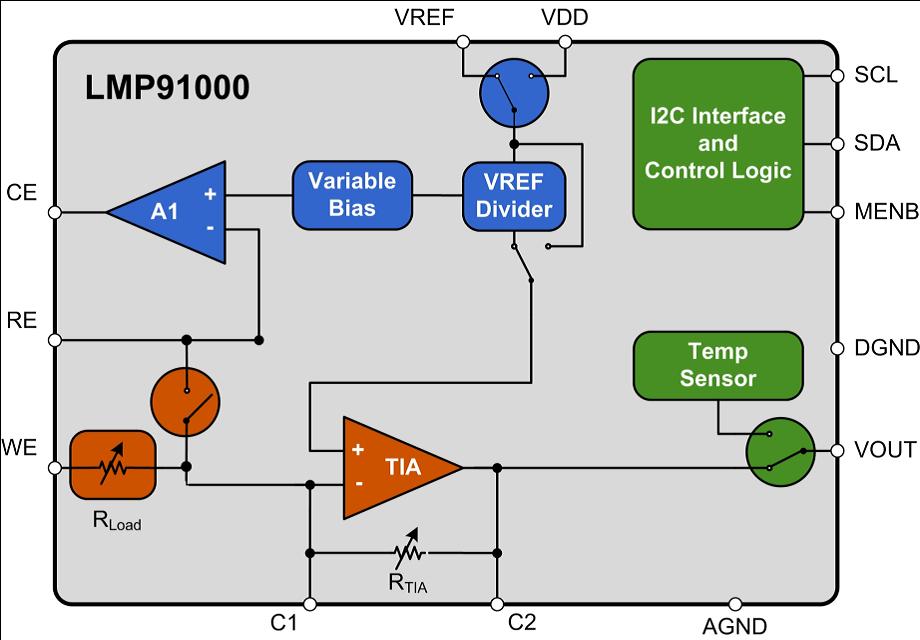 LMP91000 是一款专为电化学传感器前端放大应用设计的集成电路,和传统实现方案相类似其内部有偏置电压发生器、跨阻放大器两个功能单元,每个单元的工作参数可以通过I2C 总线实现编程配置,从而可以灵活适应不同的特性传感器的应用。为了方便温度补偿的实现,在其片上集成有半导体温度传感器,其温度信号输出可以分时输出或者单独输出。LMP91000 的内部功能框图,如下图-2 所示。相比于传统的双运放的方案,LMP91000 具有明显的低功耗,平均功耗仅10uA;PCB 封装面积小,仅5x5mm;灵活性高,可编程设定功能单元所需工作参数点。