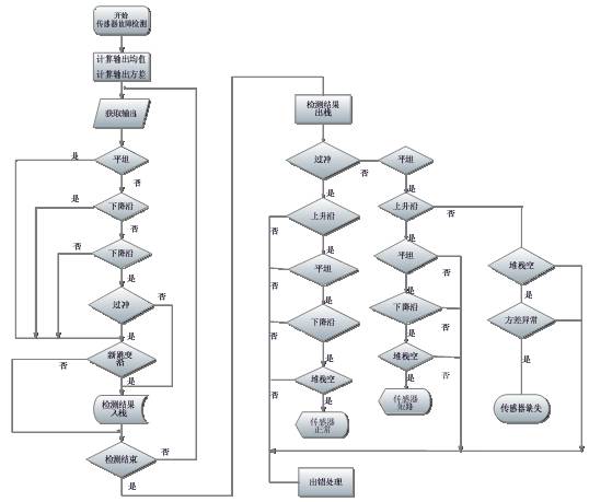 以上测试给出了电化学传感器的常见电极故障下对应的输出波形,并对各自输出特性进行了简要分析,以下是一种可供参考数据分析处理流程。主要实现方法是启用故障检测功能后对采集到的所有数据进行遍历查找,找出其各种变化沿的特征信息并存储,根据其跳变沿特征以及是否存在过冲等特点区分各种对应的故障。启动故障检测时,可以在单片机可以通过I2C 接口修改LMP91000 内部REFCN 寄存器,从而实现对传感器偏置电压的改变,偏置电压的维持时间长短可以通过定时器来控制;定时结束后开始对输出数据的分析。