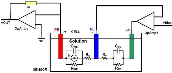 参考电极(RE)相对于工作电极(WE)保持恒定电位,工作电极(WE)收集敏感气体在反应中产生的电流并且通过后级运放实现对弱电流信号的放大。三电极传感器的检测效率、灵敏度受偏置电压影响明显;传感器对敏感气体的选择性同样会到偏置电压的影响;在应用过程中应该保持偏置电压恒定。