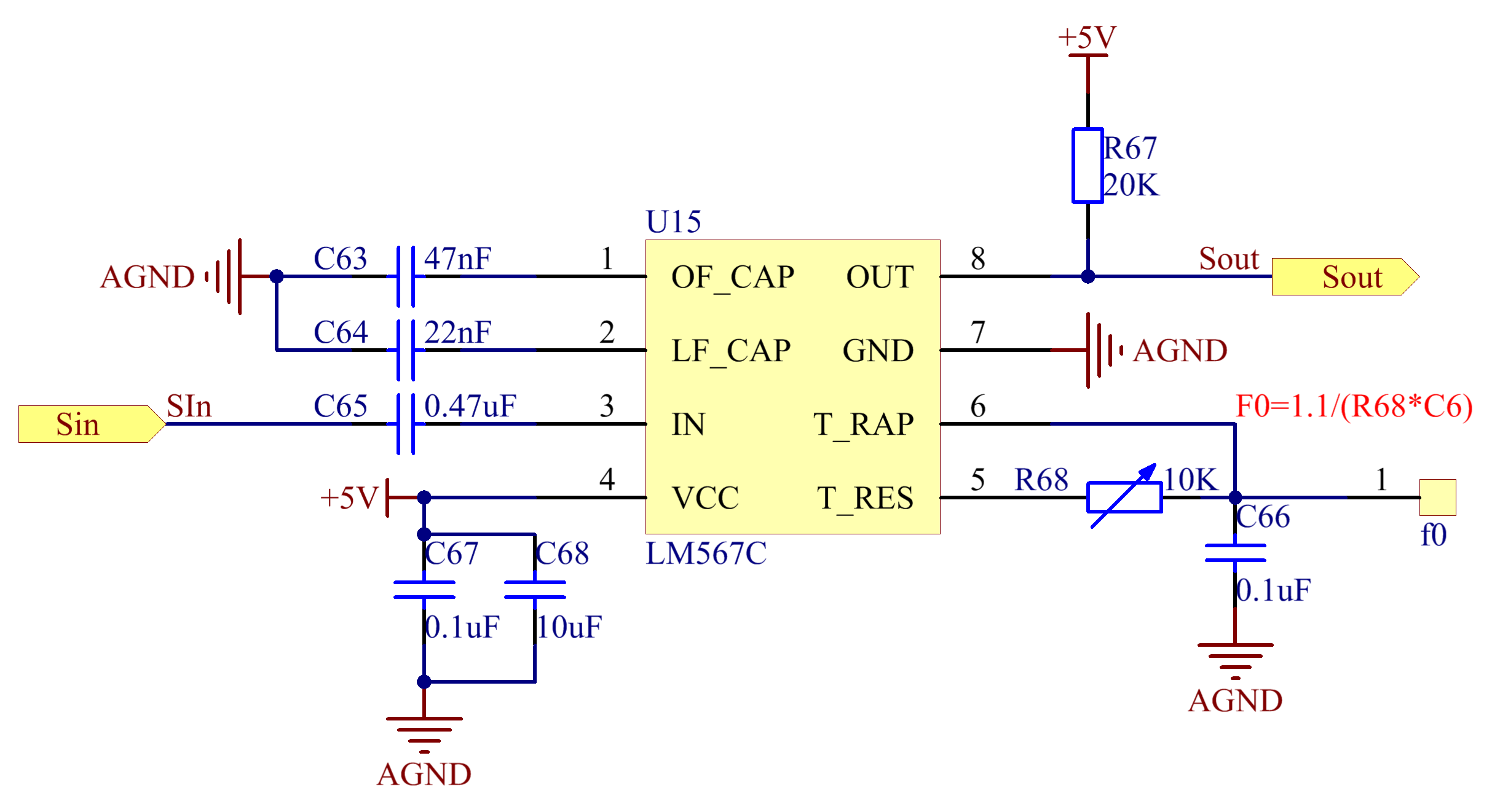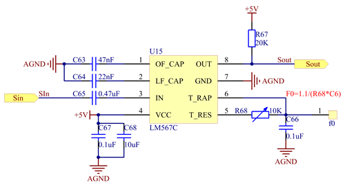 给定固定频率的输入信号Sin,通过调节变阻器R68,使LM567C的中心检测信号频率f0与输入信号频率基本一致,得到输出信号Sout。