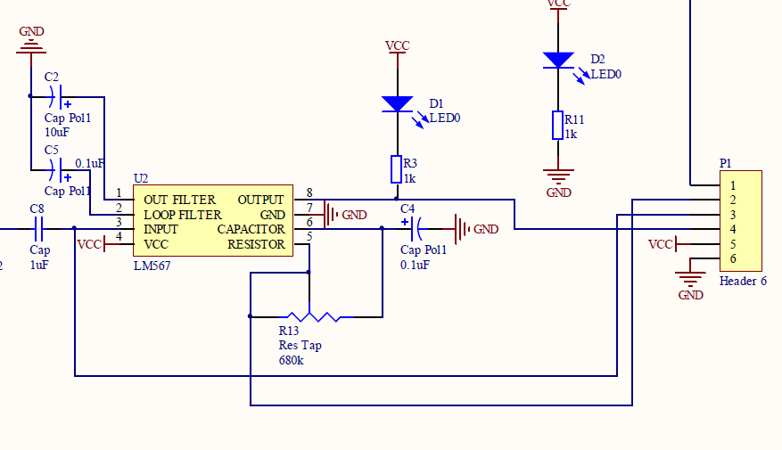 根据LM567C datasheet进行电路设计如下,但是目前LM567C无法正常工作,起不到检波的作用,麻烦各位大咖帮忙分析一下具体原因。