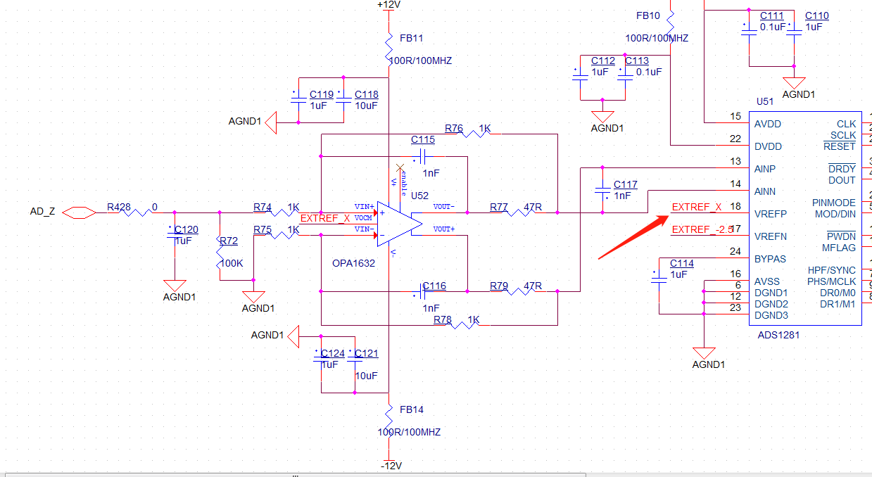 1281开发板采用的运放为OPA1632,开发板上信号V+与V-为信号输入端,
