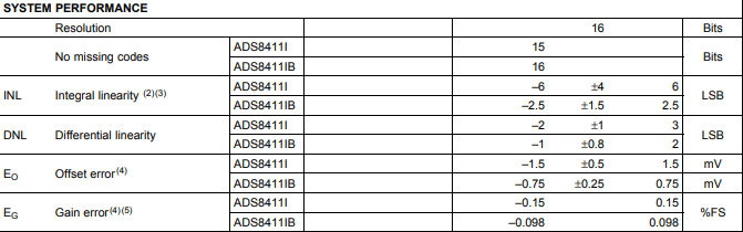 问题1: 规格书第3页 内 SYSTEM PERFORMANCE 项 “No missing codes” 提到 15bit (ADS8411I ) ,16bi(ADS8411IB )