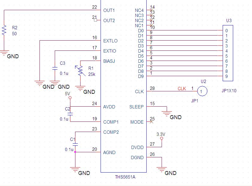小弟使用的THS5651A内部压准,电路图如图,D0-D9用FPGA输入全0变为全1再变为全0再全1一直循环,clock也是用FPGA循环输入单脉冲,当调节电位器R1为2K时,满量程应为20mA,OUT1应该为0V-1V-0V,但结果是0.5V-1V-0.5V,输入全0时输出为0.5V,有电流输出,调整电位器为20K时就不存在这个问题,OUT1输出为0-0.1V-0(后级接运算放大器放大为0V-1V-0V)。这是什么情况,是用的不对吗?换了个THS5651A也是这种情况,求各位用过的大神指导