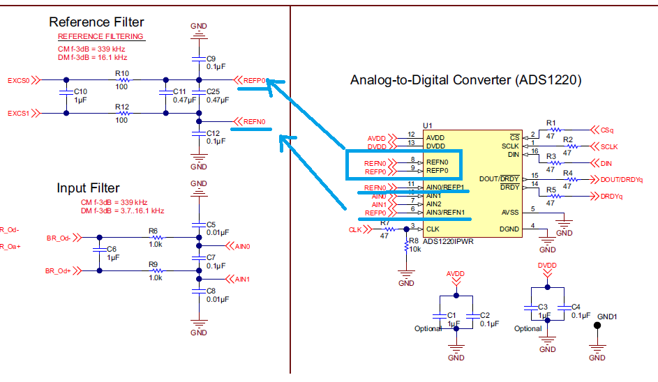 我学习了TIDA-00765号参考设计,但是有一处不解:在该设计中ADS1220的参考输入端REFP0和REFN0通过外置滤波器与电桥的激励电源EXCF0和EXCF1相连。这是一个交流桥式激励的示例,因此电桥的激励端EXCF0和EXCF1的极性是会交换的。这势必会导致ADS1220的REFP0和REFN0的极性也随之而交换。但根据ADS1220 datashee中第6.3节 Recommended Operating Conditions 表格中V(REFNx)和V(REFPx)的规格指示,V(REFNx)不能高于V(REFPx)。