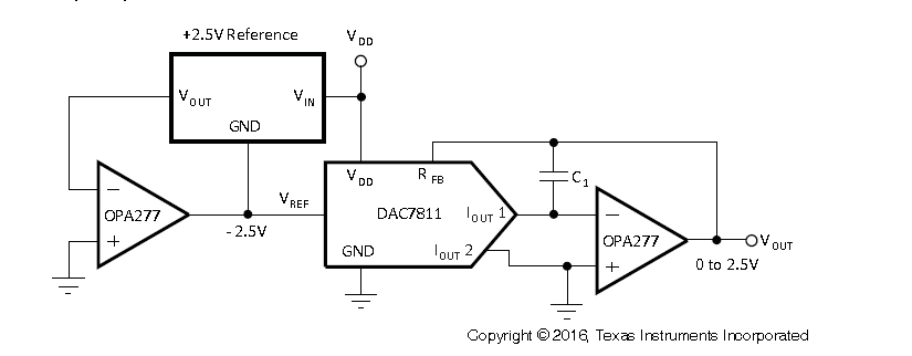 使用了软件SPI,用示波器看到波形是正确的,但是在将4095发给DAC7811之后,只测得输出的电压不到1V,也就0.97V左右的样子,原理图是按照芯片手册给的推荐电路设计的。参考电压是4V。