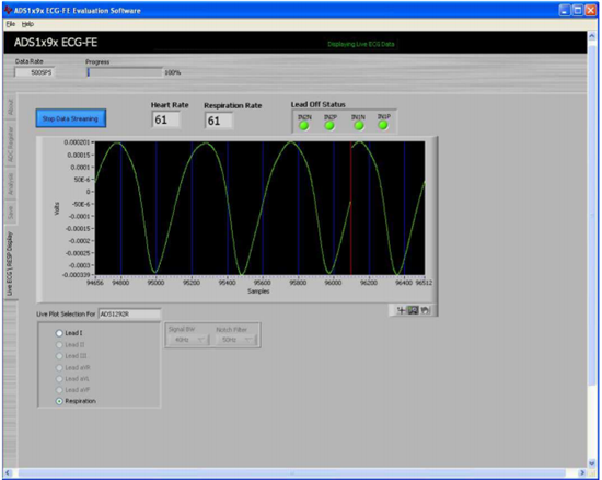 从TI申请了一个ADS1292R模拟前端,见下图。利用ADS1292R既可以测ECG,又可以测呼吸(RESP),根据ADS1x9xECG-FE的用户指导以及ADS1292R的datasheet可知,最少只需要两导联线就可以测出心电信号以及呼吸信号。