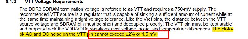 现在,想要请问下,①VTT供电电源变换是否会导致 DDR 的Leveling 出现time out的异常?②VTT的变化范围在多少之内是允许的?【因为,我发现TI给出的文档上,有一处描述有点对不上,sprabi1c- DDR3 design requirements for Keystone Device,对于电压的稳定性,噪声方面有问题,如下图,±2%, or 1.5mV】