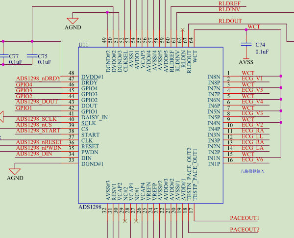 2路自肢体导联可以采集到心电信号,6路胸导联一直采集不到,胸导联的负输入为WCT,采集到的数据毫无心电特征,整个ADS1298原理图基本和官方的一致。