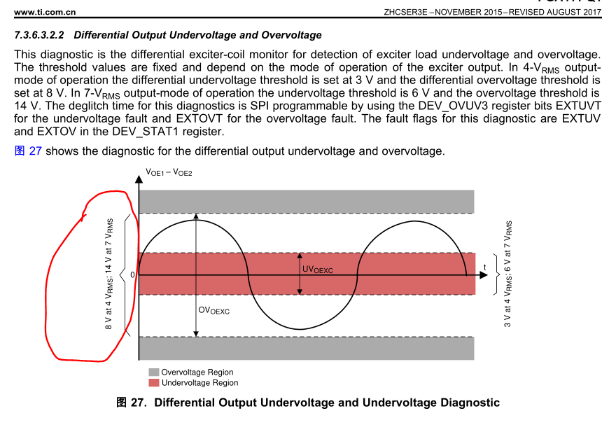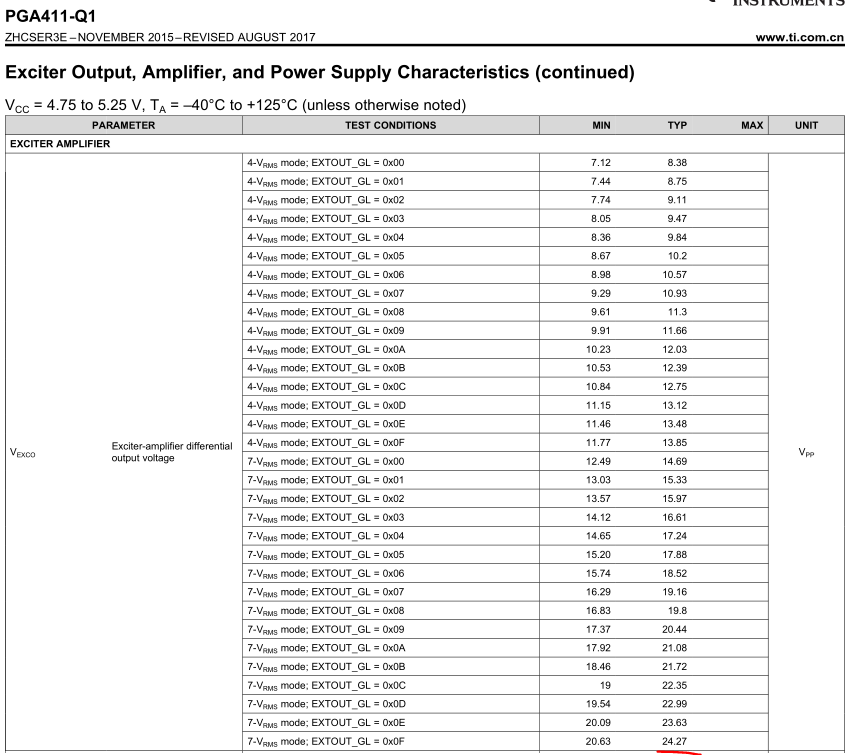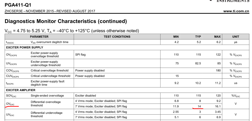 问题:规格书第10页和第35页OVEXC过压保护点为14V(7 Vrms mode),而第8页VEXCO输出电压最大能到24.27V(7-V RMS mode; EXTOUT_GL = 0x0F)。测试时设置7-V RMS mode; EXTOUT_GL = 0x0F,VEXCO=22.6V,PGA411没有报OVEXC过压故障,波形见图4。请问OVEXC过压保护点(Differential overvoltagethreshold)是如何理解的,保护点是多少V?