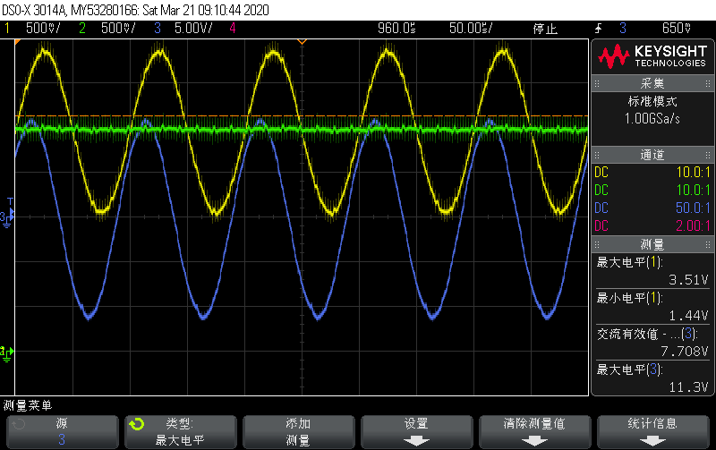 图4 实测波形(7-V RMS mode; EXTOUT_GL = 0x0F,蓝色为VEXCO)