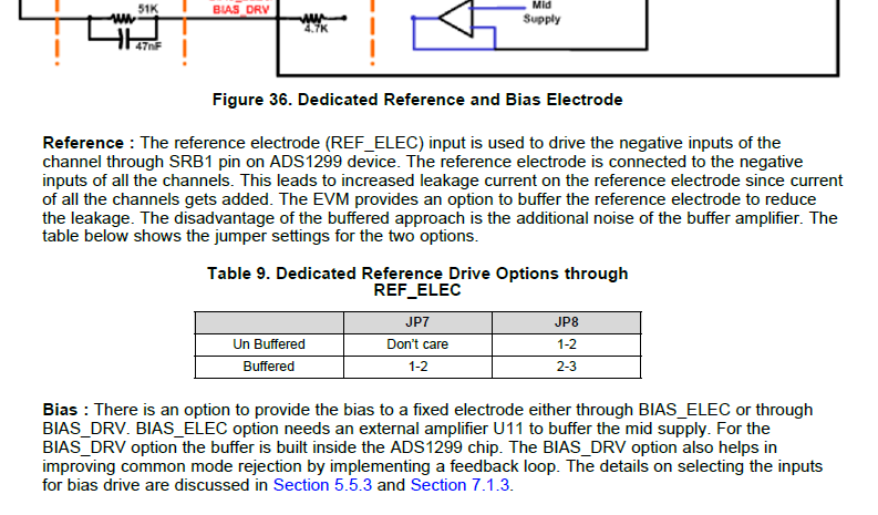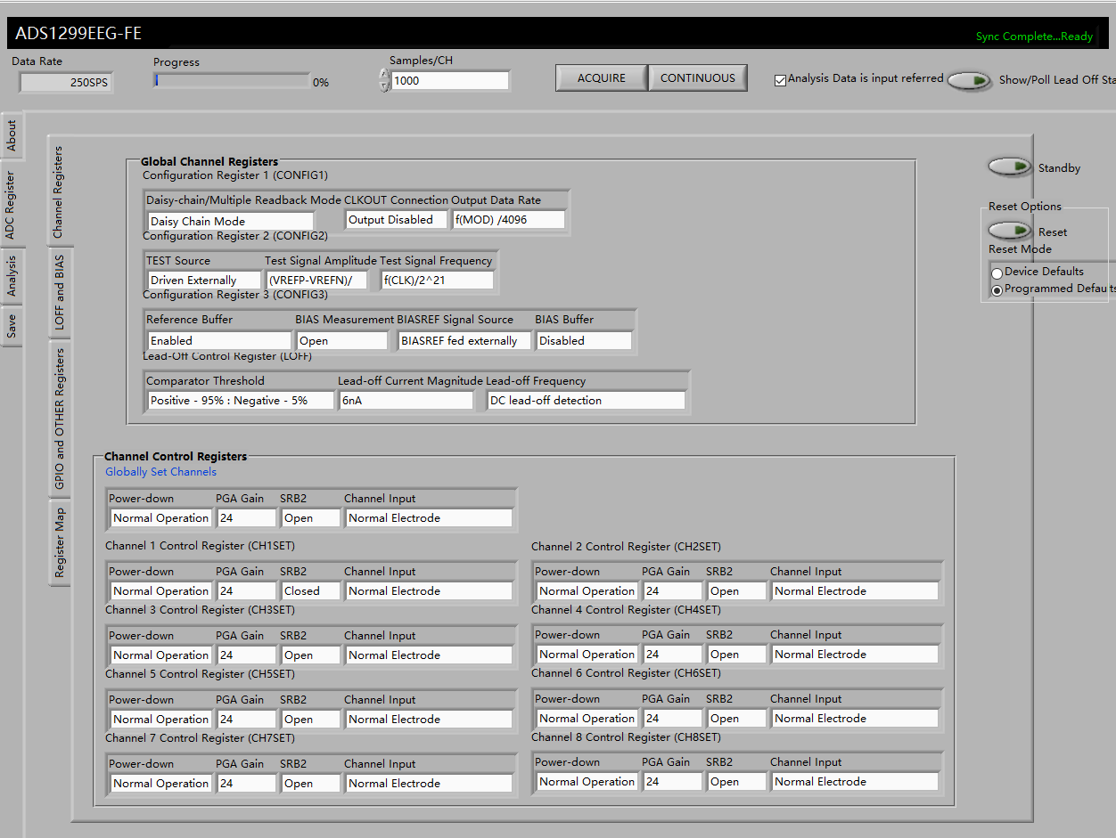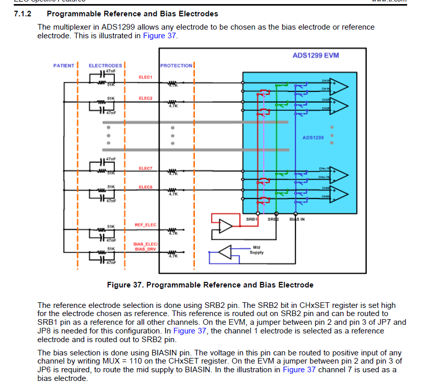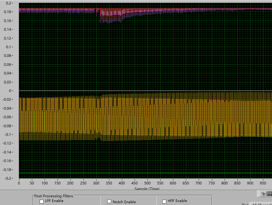 你好。是的,按照EVM user's guide一步步连接的,供电电压,输入电压都没问题。两种接法出现的波形都不正常。我描述一下我EVM开发板上的跳帽设置:JP1(1-2),JP2(2-3),JP6(2-3),JP7(2-3),JP8(2-3),JP20(2-3),JP25(3-4,5-6) 其他均为默认接法,我设置的是单端输入。然后ADS1299ECG-FE软件设置先将软件复位(Programmed Defauts),再将Channel 1中的SRB2打开(即Closed(On)),再将SRB1打开(Closed(On)),这时候不就是将Channel1设置为参考电极了吗?通过Channel1的正极输入信号,作为各个Channel负极的输入。然后我这时候用Channel 2的电极贴在前额,Channel 1的电极夹在耳垂那里。可是输出来的波形看起来并不是脑电波。