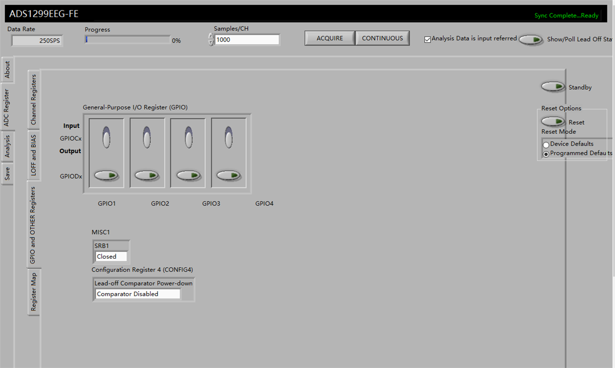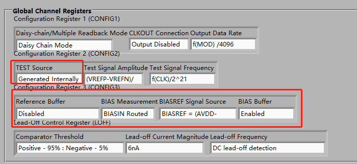 看了不行之后,又进行了下一步的设置:检测电极是否有连接上。将寄存器3的设置如下:,但是我无法理解Reference Buffer应该如何设置?我这么设置是否正确?再将寄存器2设置为内部信号源,寄存器1和LOFF按复位设置没变。