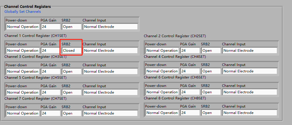 我用Channl7作为偏置控制寄存器(将电极插到通道7的正极,并夹在另一边的耳垂上)设置如下: