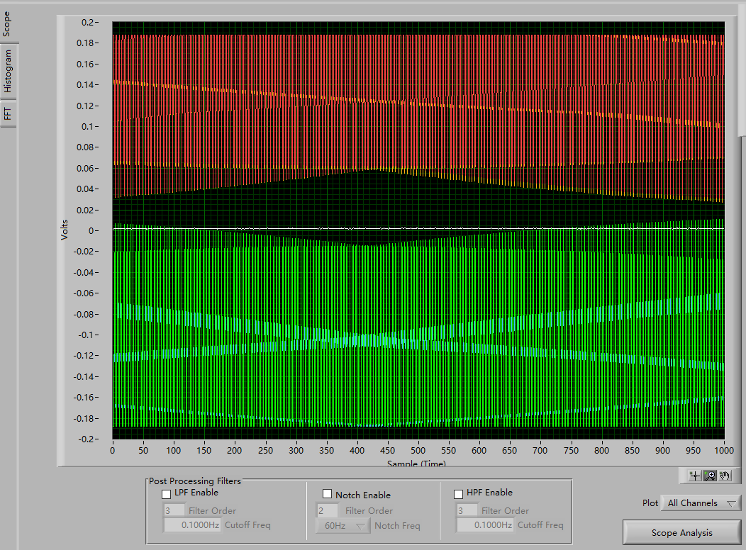 从图中看,显示的ch1、ch2、ch7的波形是一样的,其他的波形跟ch1是相反的。但这并不是脑电波啊。我想问我应该如何设置才可以稳定的测出脑电波波形呢?