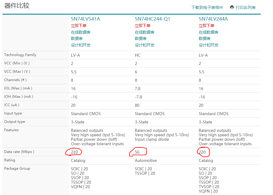 SN74HC244和SN74LV244在选型比较中有提到其Data rate分别为56Mbps和220Mbps。