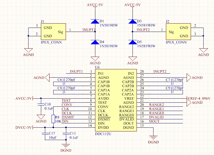 图中的钳位二极管由于对信号有影响,在实际使用时,被拆掉了,数字5V与模拟的5V是分别采用LDO供电的。