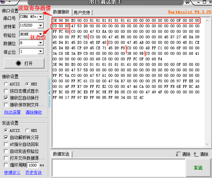 如图所示:状态位之后,第一通道为MVDD,第八通道为系统噪声,其余通道关闭(具体配置可看图中寄存器value)但可以看到第三次读取数据关闭的通道也有数据。