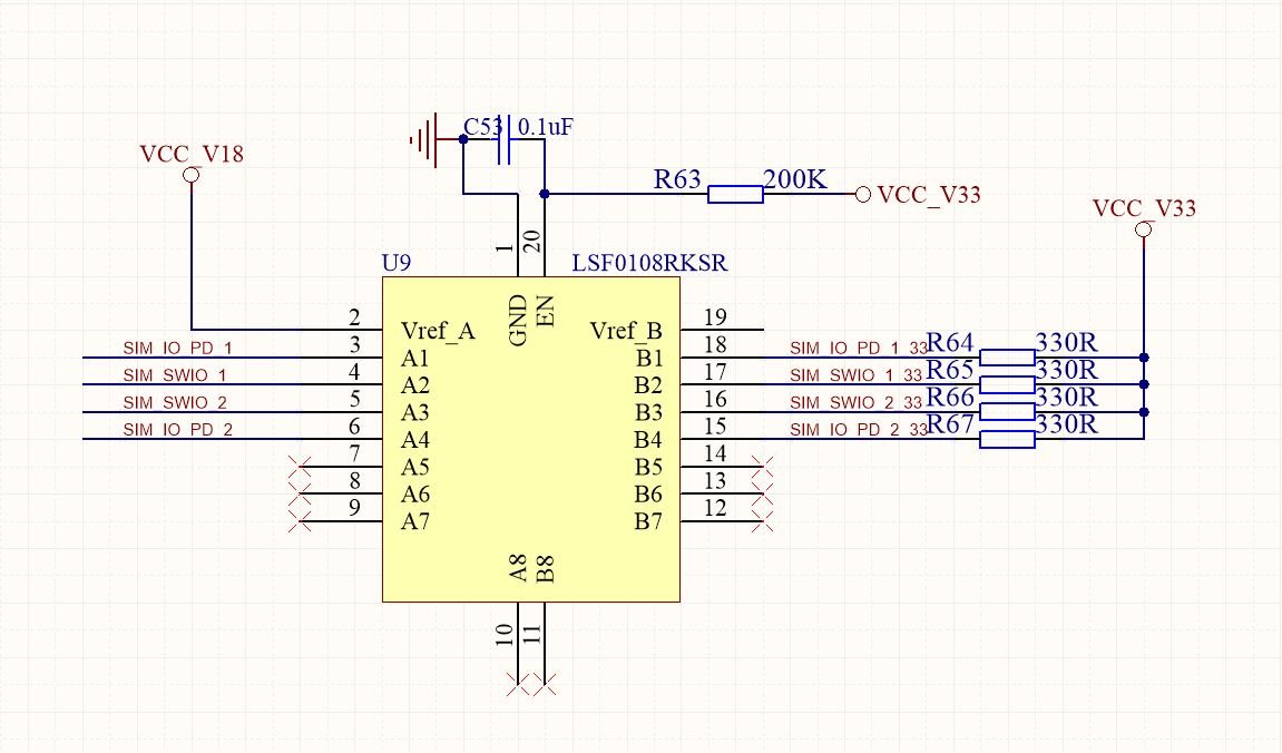 LSF0108的电路图如上,B1管脚信号电平为3.3V,期望A1管脚的电平为1.8V,但是实际测量A1管脚开路电平为2.5V,请问是我的原理图设计有问题吗?麻烦各位大神指点一下,困在这里好久了!多谢!