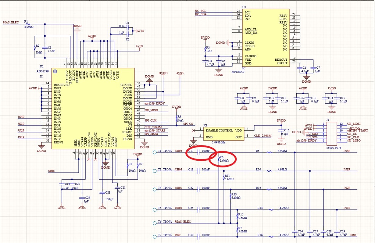 请教一下 ,我在使用ads1299-4的过程中,发现第四通道有很大的直流偏量,而且会随着时间慢慢漂移,但是其他3个通道都是正常的信号,很稳定。去掉如图标记的C17和R6(把C17短接)就是正常的,其他设计都是按照官方的,只是前端滤波加了一个AC耦合,请教一下这个会是什么原因