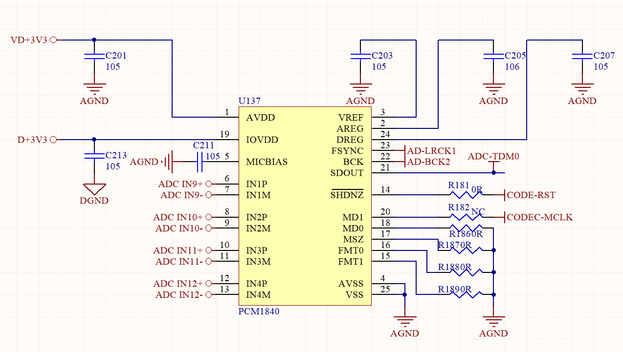 TI的朋友们,应该修改一下PCM1840的手册,输入最大值为差分960mV RMS,而不是现在手册上标称的2V RMS,同时信噪比的值也应该下调,因为输入幅度下降一半,同等条件下,底噪必然变大!