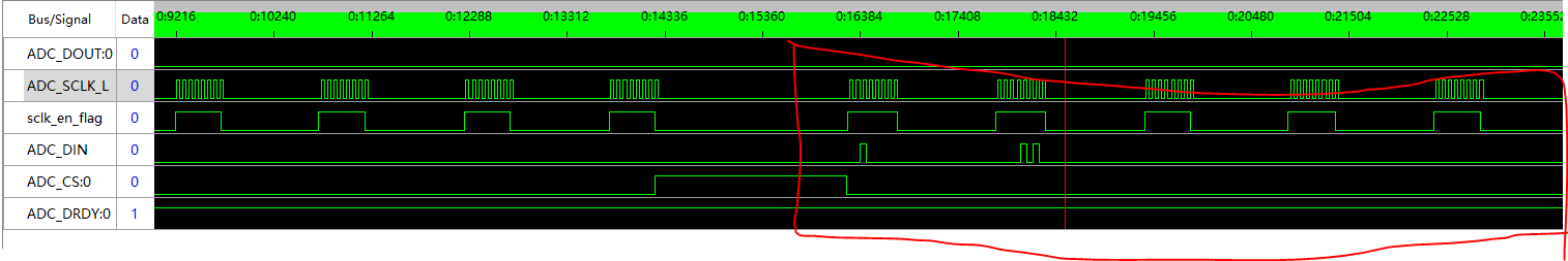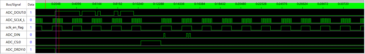 如图,是采用FPGA读取ADS1283寄存器的输出波形,通过ADC_DIN引脚输入20,0A,分别代表从0地址读取11个地址的参数数据,但是DOUT并未输出参数,目前DOUT可以正常输出采集数据波形,图中显示在DRDY出现时输出了采样数据波形,而DIN的输入并未使DOUT输出参数波形,CLK目前是2.75MHZ,sclk是1.375MHZ,根据时序图也采用了SCLK中断的模式,请问是否读参数或者写命令是哪里不正确呢?