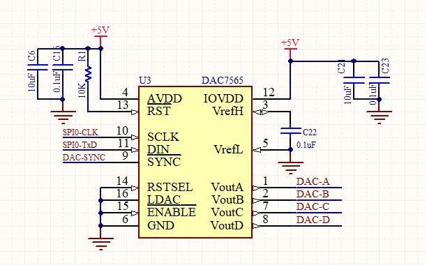 最近在DAC7565使用上遇见一些问题,我的电路如下图,我想使用内部基准电压2.5V,