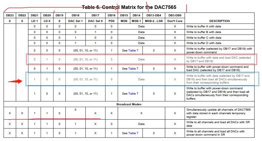 1.手册上表6,下图蓝色框标注的。我只要发送该一条命令,模拟通道就会“实时”输出数据对应的电压对吗?不需要其他的更新命令了吧?发送该命令之前,按照手册默认是使用基准电压,还需要在之前发送使用基准电压的命令(table3)吗?