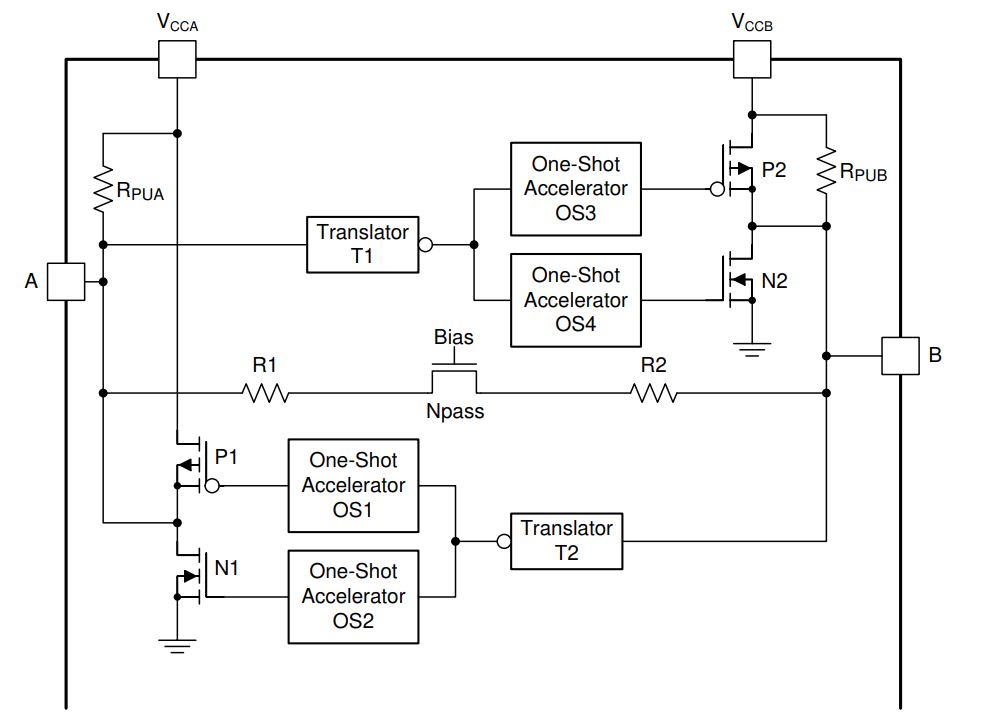 文档中提到有边沿跳变,输出一个one-shot信号,以加速推挽管导通,那么MOS管是否可以保持长期导通,因为我只是把它用作了很低速的IO,可能长期处于一个固定的状态。不妨假设A 入 B出,A是低电平,那么N2是导通的,以致于B变低,B变低又导致N1接通,这样N1管子是通的,A要输出高电平该怎么办,我的理解是除非N1阻是那么低,驱动才能把它拉到高电平。但手册中又有写: