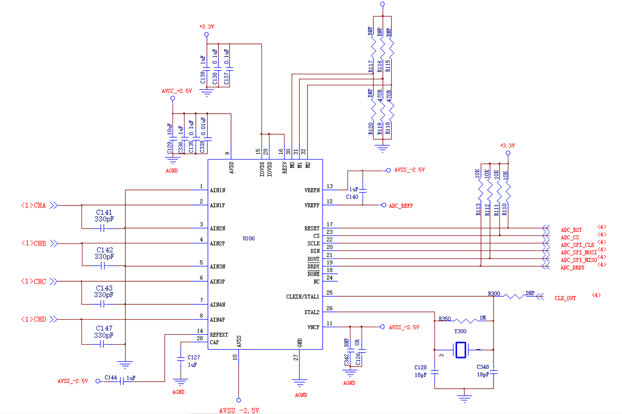 本项目想用ADS131A04测量±2.5V以内信号,原理图如下,麻烦确认一下有没有问题,谢谢。