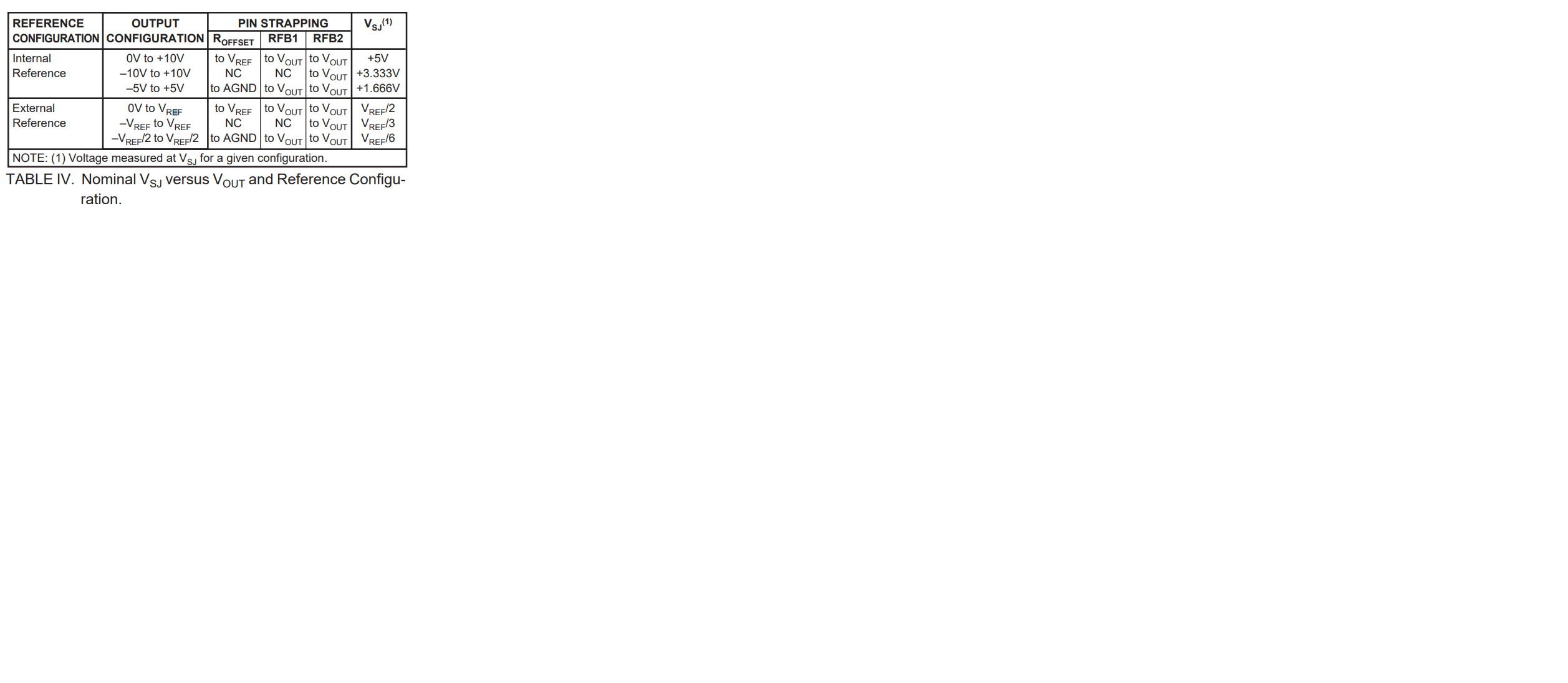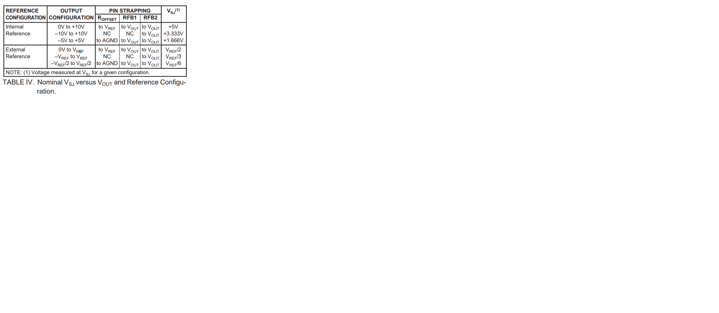 通过Table IV可以看到,当使用internal reference, unipolar mode时,引脚Roffset需要接到Vref端RFB1 接Vout,RFB2接Vout,Vsj=5V。