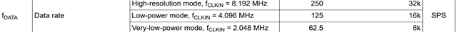 查阅ADS131M04 手册 知道 ADS131M04 的输出速度取决于 CLKIN 速率 ,我使用了外接晶振8.192mhz 。输出模式 High-resolution 正常,但是我需要低功耗所以将模式改为 Very-low-power 或者 Low-power 时读取数据异常; 我怀疑 使用 Low-power 需要将晶振改为 4.096mhz ,使用Very-low-power 需要将晶振改为2.048MHZ ,不知道我的猜测是否正确;
