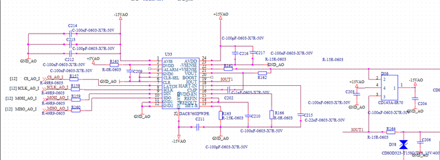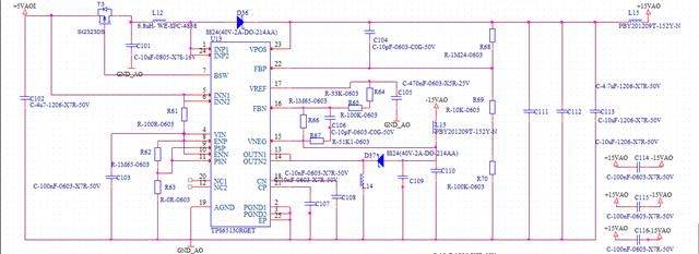我的AVDD是15V,有两块DAC8760,同时Iout enable时,并同时输出20mA,这时输出的电流达不到20mA,只有2.5左右,而且我的DC DC转换电路,功率电感有啸叫,同时输出10mA是没有问题的,所以我怀疑我的±15V电源太小,我的DC转换电路的芯片用的是TPS65130RGET,下面是我的电路。