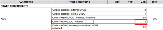 您好,不是电源太小了,您可以看下,当code为0x0000,Iout enable时,此时AIDD最大电流只有3mA。